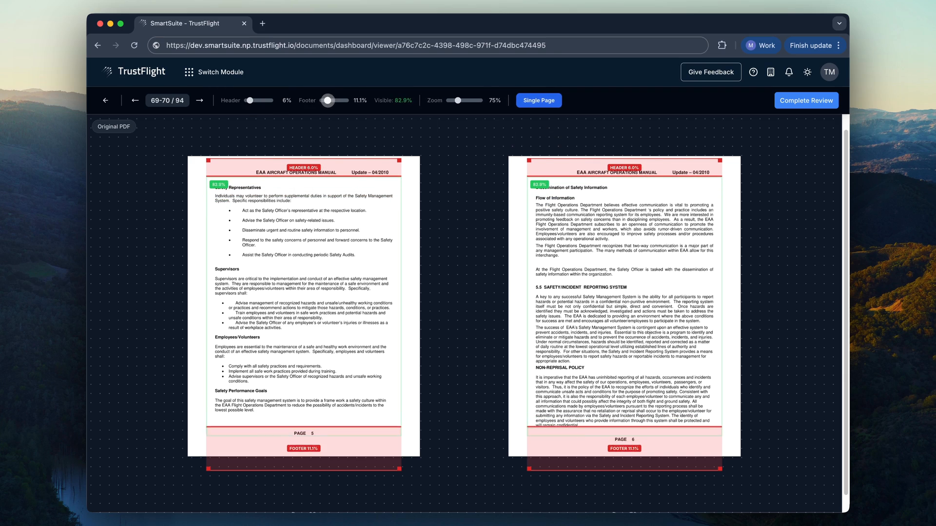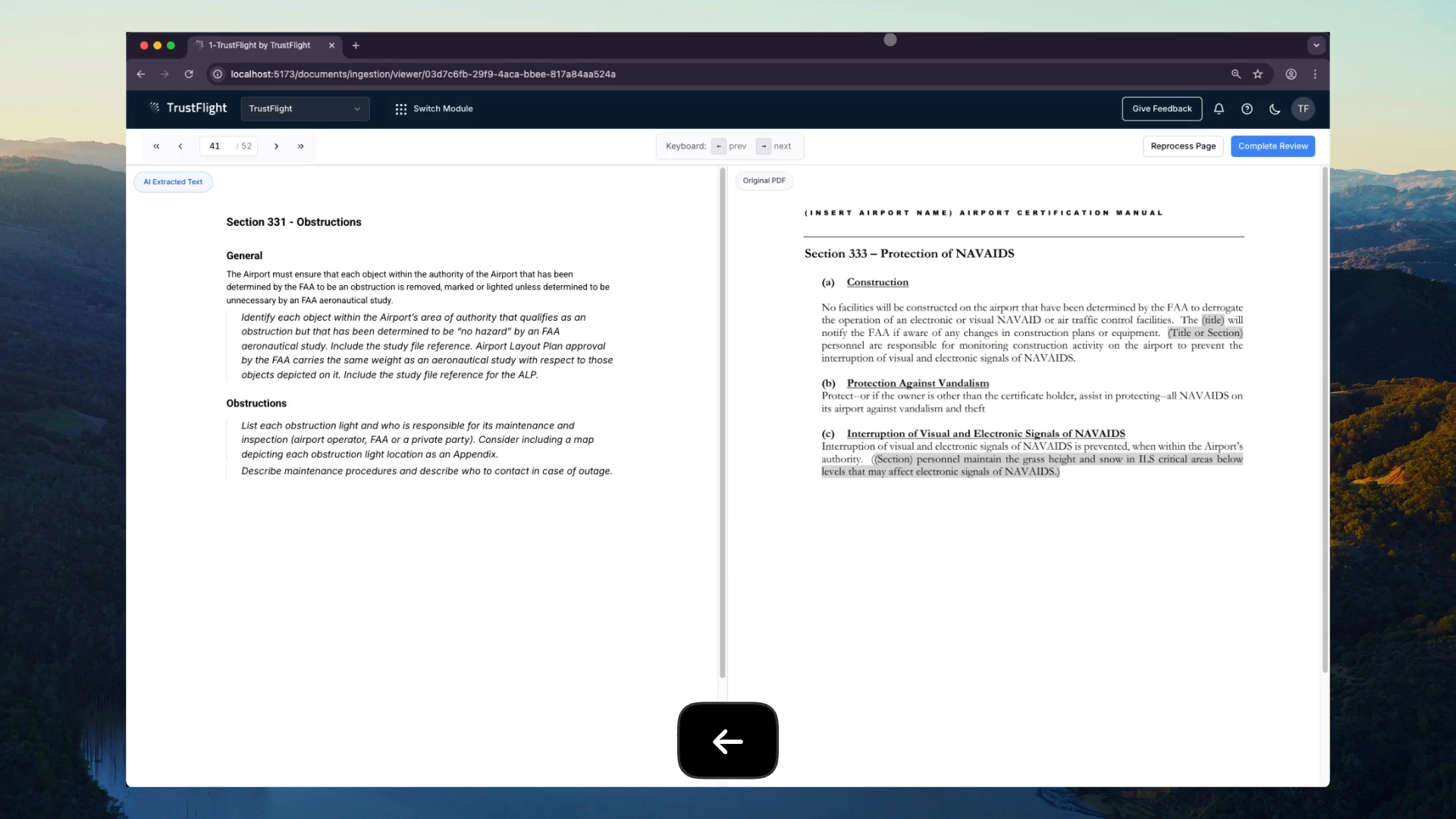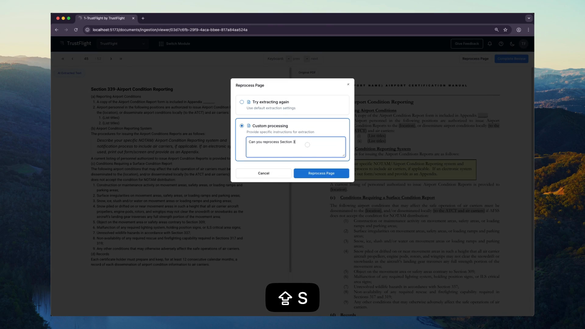 Once boundaries are set, the system extracts structured content and operators review it in split-screen: original PDF on the left, structured output on the right, scrolling in sync. Detection and correction are separate tasks. Operators focus purely on identifying problems by scanning the original, spotting discrepancies, and describing what's wrong. They type corrections like "This table should preserve nested structure" or "Numbering sequence broke at step 4" or "This is an MMEL exception table, not a checklist." Side-by-side review is three to four times faster than inline editing because it eliminates the cognitive load of fixing problems while still identifying them.