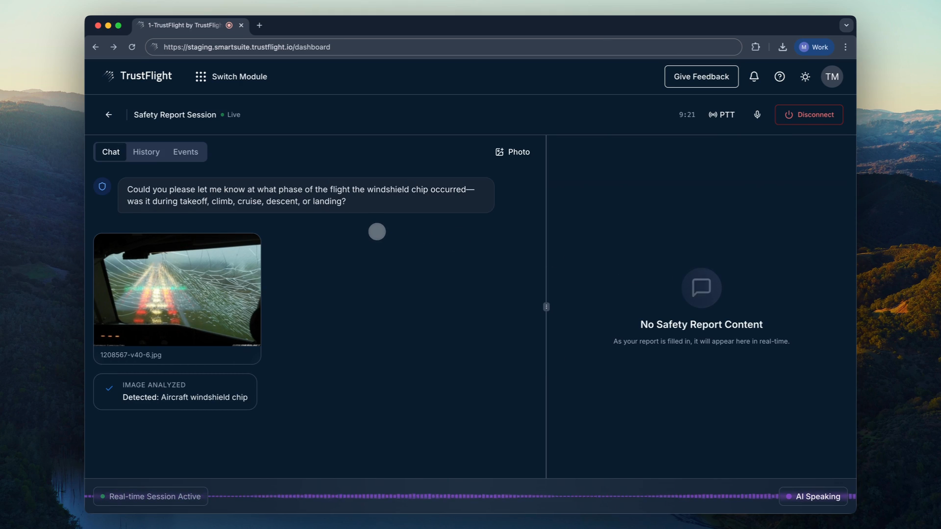 When a photo is uploaded first, the system analyzes it while pulling in flight context if the reporter recently operated an aircraft. A pilot who just landed uploads a windshield chip photo. The conversation begins with aircraft registration, flight number, and timing already populated, plus an initial observation: "I can see damage to the windshield. Was this discovered during preflight or did it occur in flight?"