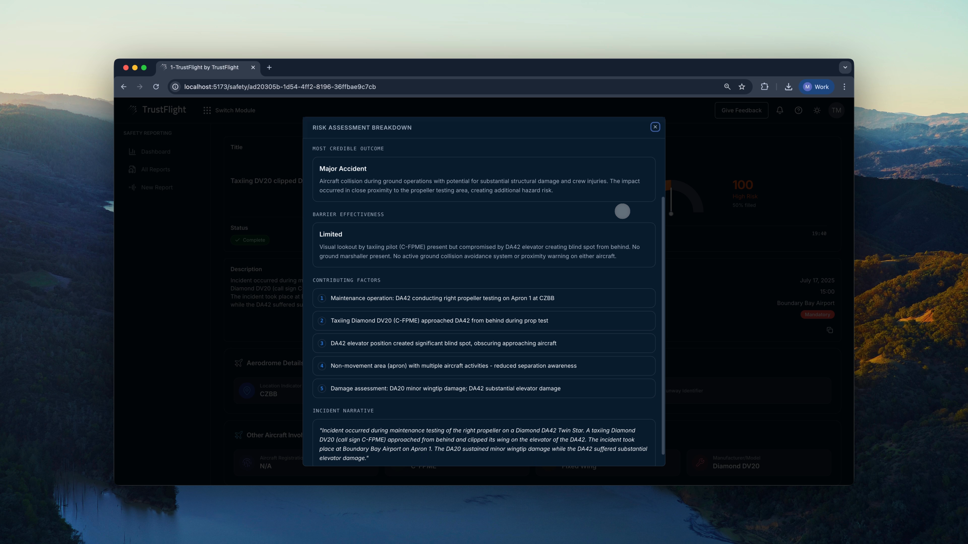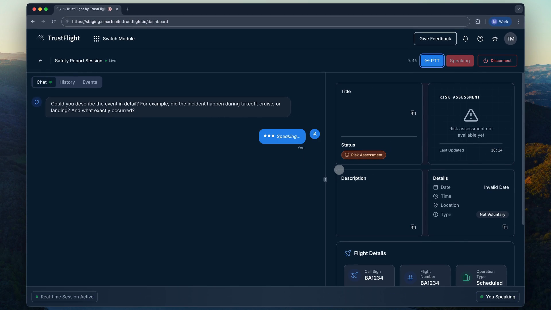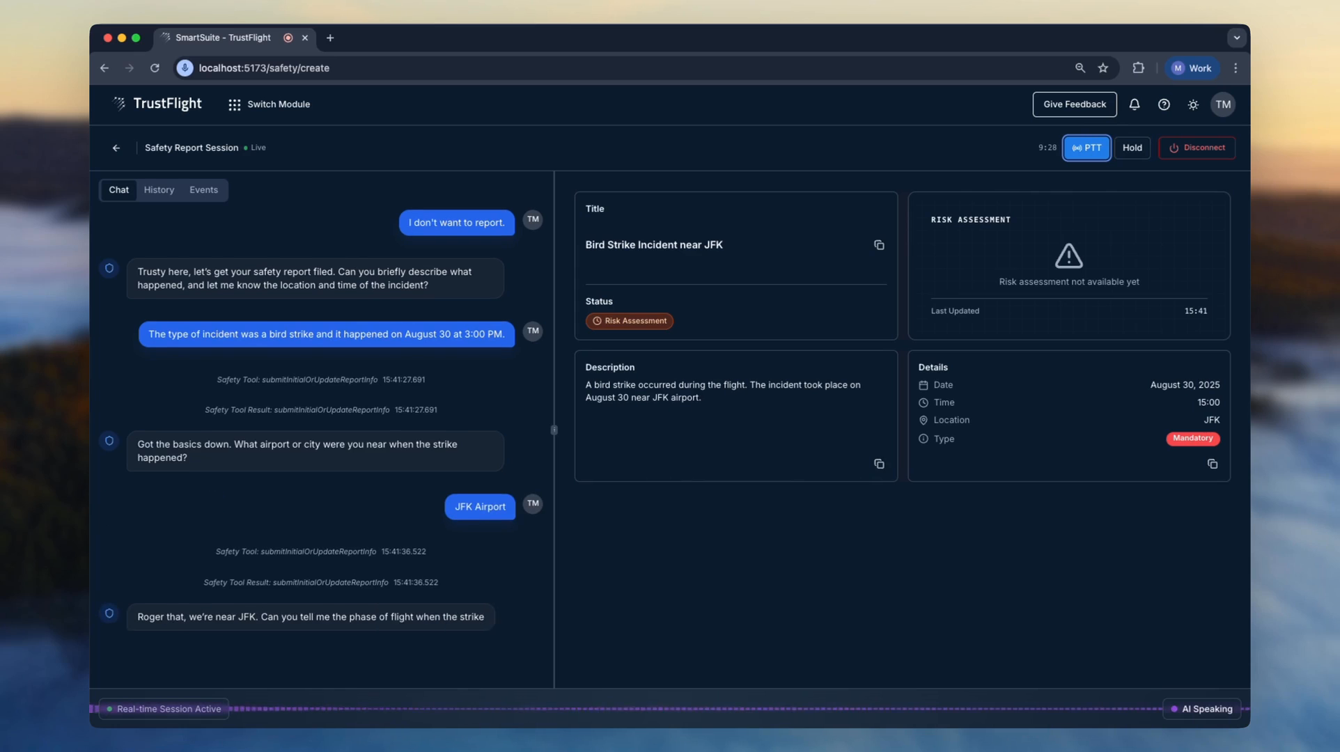We rebuilt safety reporting as a voice conversation that captures incident narratives naturally, then automatically performs structured risk assessment using aviation safety methodology.